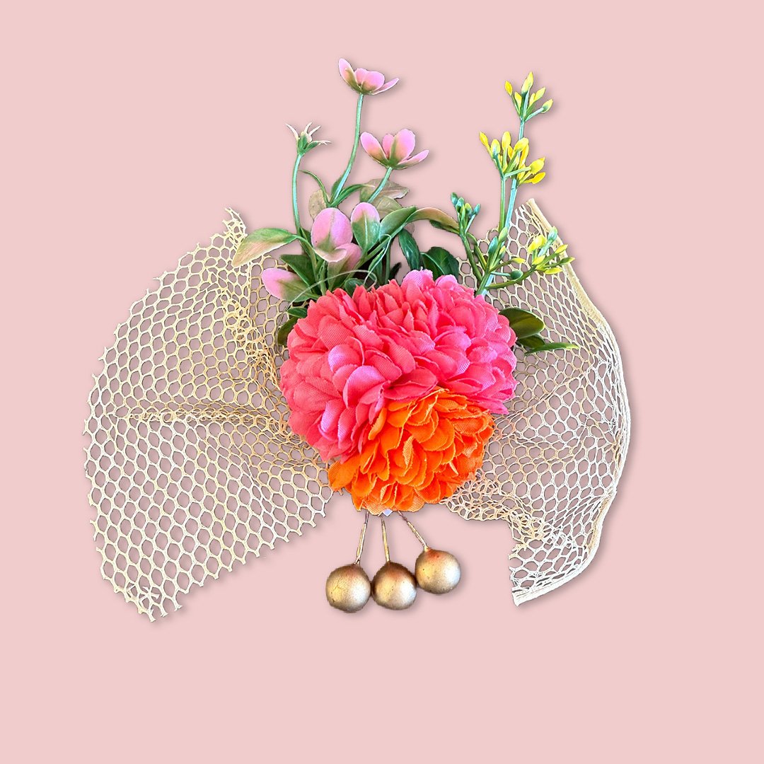 A stunning artificial flower brooch with mesh net design and golden pearl hangings. Ideal for hamper decoration, trousseau packing, gift wrapping, baskets, or return gifts