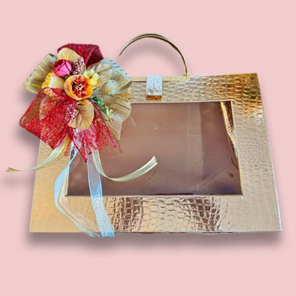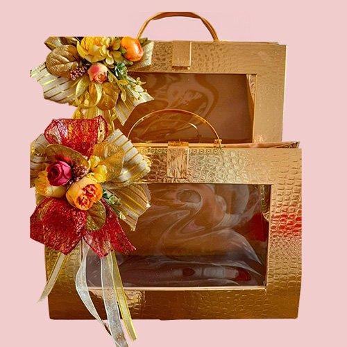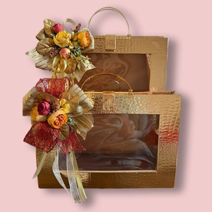 Lavish gold-finish gift boxes in two sizes, highlighted with floral ribbon decor for elegant and premium packaging.