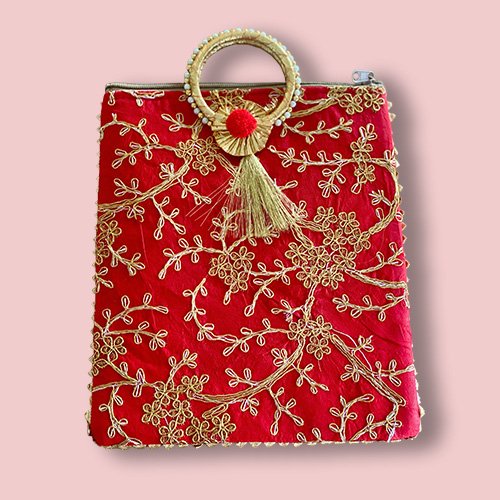 A richly embroidered red clutch bag with gold floral patterns and a fancy handle. Suitable for gifting during weddings, pujas, or festive ceremonies.