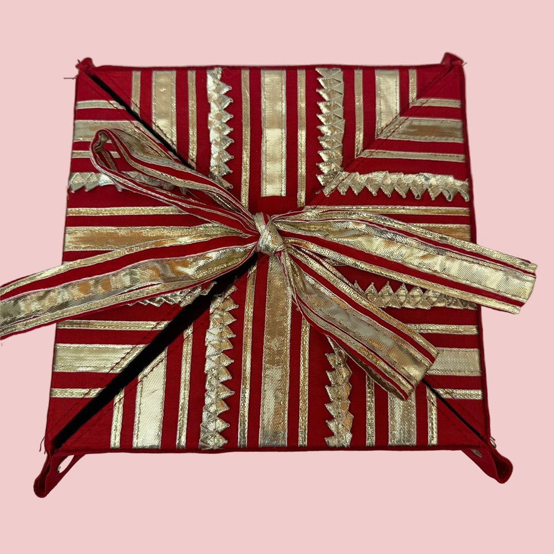Premium handcrafted gifting tray wrapped in red fabric with golden lace design and bow. Perfect for presenting sweets, dry fruits, hampers, sarees, wedding shagun, and traditional ceremonies.