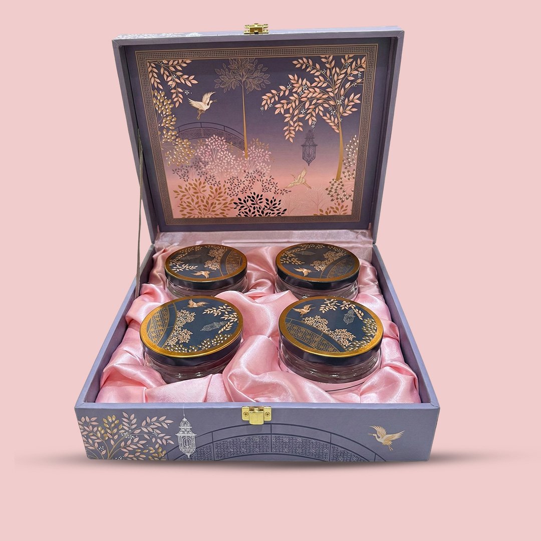 A luxury gifting box crafted with intricate gold foil artwork and a silk-lined interior. Comes with four premium glass jars—perfect for gifting dry fruits, sweets, chocolates, or festive treats. Ideal for weddings, corporate gifts, and special occasions.